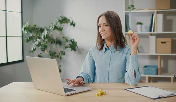 freelancer-holding-gold-btc-coins-in-hand-woman-stock-trader-earning-bitcoins-after-on-SBI-350491285