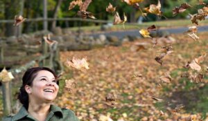 a-young-woman-enjoying-the-autumn-season-with-falling-leaves-SBI-301048889